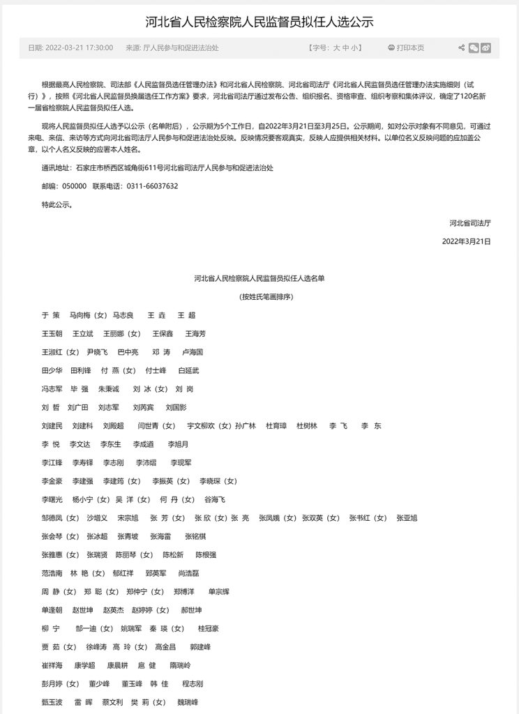 河北省司法厅根据最高人民检察院、司法部《人民监督员选任管理办法》和河北省人民检察院、河北省司法厅《河北省人民监督员选任管理办法实施细则(试行)》,按照《河北省人民监督员换届选任工作方案》要求,通过发布公告、组织报名、资格审查、组织考察和集体评议,确定了120名新一届省检察院人民监督员拟任人选。