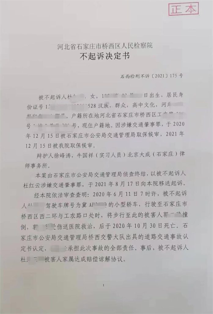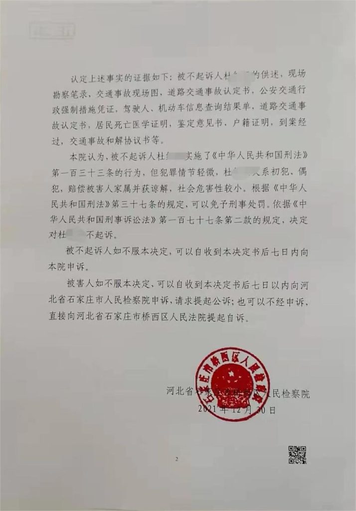 2021年4月23日公安机关以杜某某涉嫌交通肇事罪,向检察机关移送审查起诉。2021年12月31日,检察机关作出不起诉决定。
