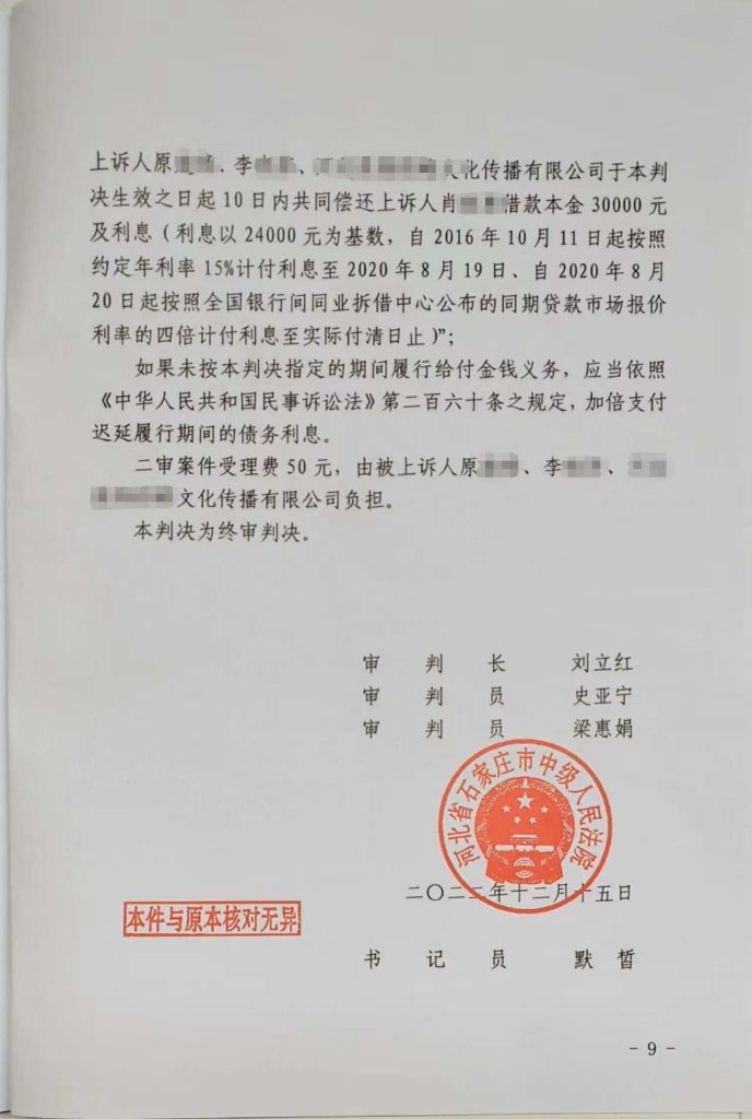 肖某与原某、李某、某文化传播有限公司民间借贷纠份一案,不服河北省石家庄市长安区人民法院(2021)冀0102民初7700号民事判决,向河北省石家庄市中级人民法院提起上诉。二审法院纠正一审法院中以6000元不能排除双方之间存在其他经济往来款项为由对该款项不予认定的错误。判决被上诉人偿还上诉人肖某本金30000元及利息。