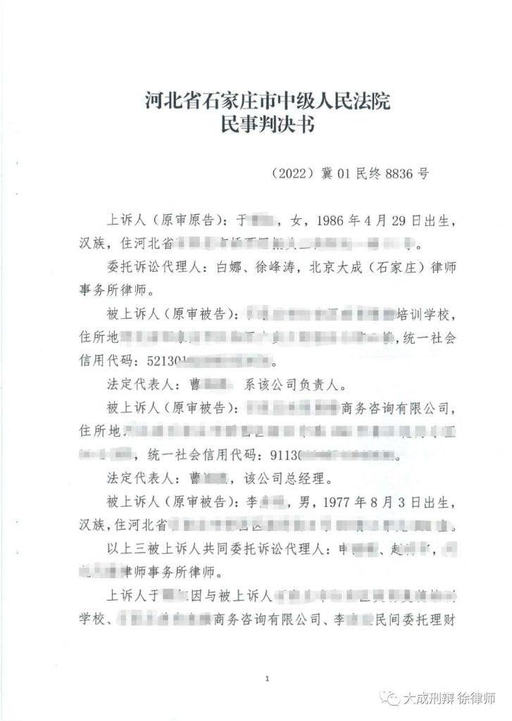 于某与某培训学校、某商务咨询有限公司、李某民间委托理财合同纠纷一案、不服河北省石家庄市长安区人民法院(2021)冀0102民初11684号民事判决而上诉。一审法院认为,本案的争议焦点是涉案款项是否交付,原被告之间是否存在委托理财合同关系。二审法院以为于某和学校虽签订了《入股协议书》,但该学校提交的证据不足以证实于某事实上享有了股东权利,二者之间可认定为名为股权投资、实为借贷,因此学校应偿还于某21312.5元及利息。